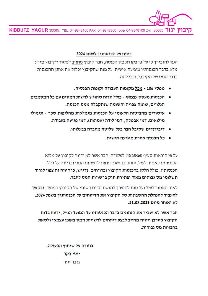 יגור מדווחת על שנת 2024 לרשויות באופן מאוחד - חברים שלא יכללו את דיווחיהם בדוחות יגור עד לסוף חודש אוגוסט - יישארו מחוץ לדיווח ויאלצו לדווח לרשויות באופן עצמאי ועשויים לשאת בחבות מס גבוהה - על הכנסותיהם וכן על חלקם כחברים בהכנסות הקיבוץ.