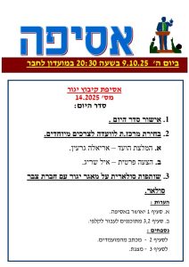 אסיפה 14-2025, ליום חמישי הקרוב 9.10.2025 ב20:30 .