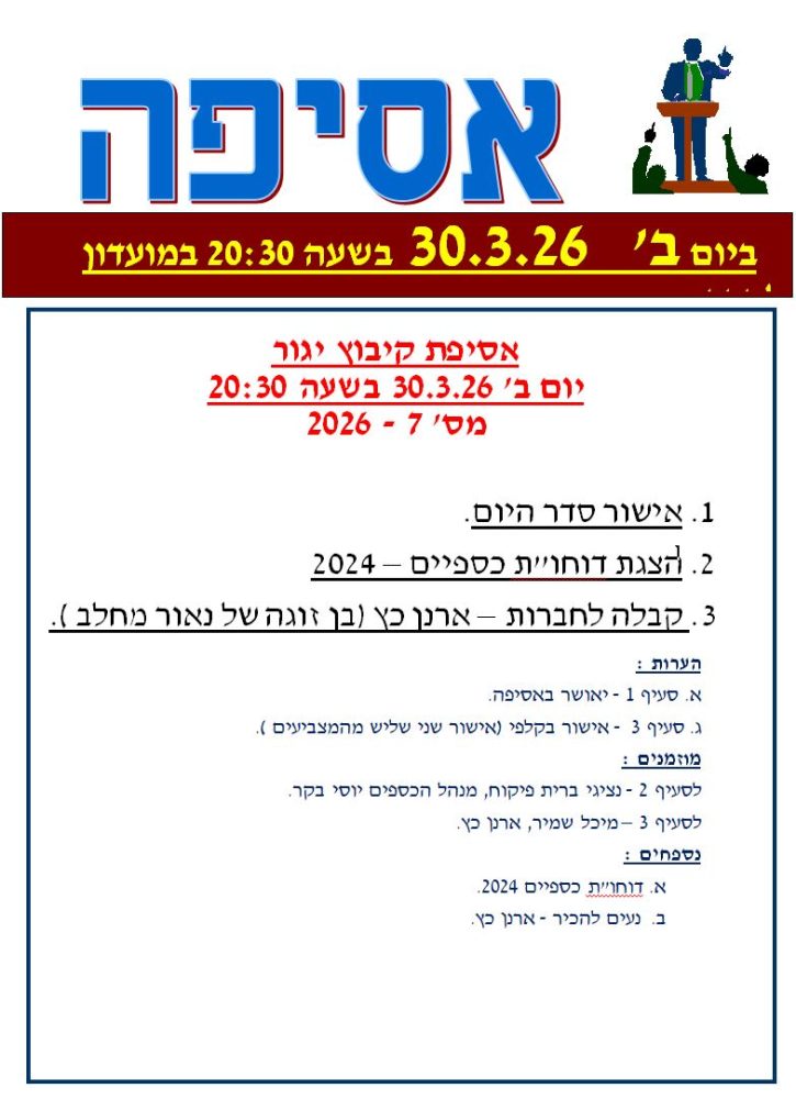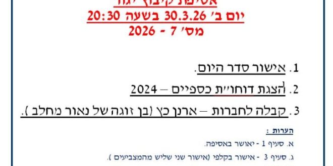 אסיפה – יום ב' 30.3.2026 בשעה 20:30