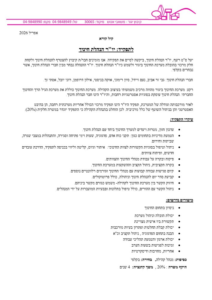 המעוניינים מוזמנים להגיש את מועמדותם לורד, מנהלת משא במייל hr@yagur.org.il עד תאריך 30.4.2026