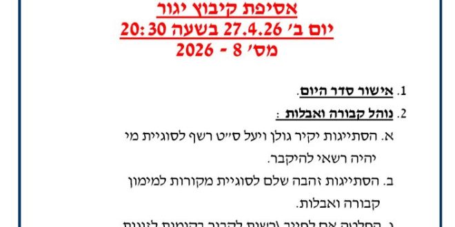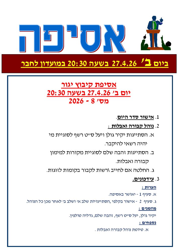 אסיפה יום ב' 27.4 20:30 – נוהל קבורה ועדכונים shimshi-agmon לפני 19 שעות אסיפות השאר תגובה 14 צפיות נספח לקראת הדיון לקריאה – טיוטת נוהל הקבורה: טיוטת נוהל קבורה אפריל 2026 הדפסה